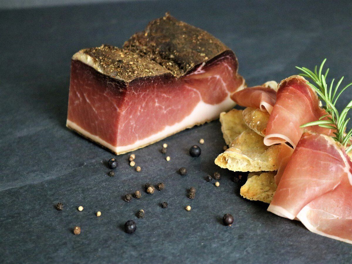 Der Bergschinken ist ein magerer und zugleich zarter Schinken, welcher am besten hauchdünn geschnitten zur Südtiroler Brotzeit gegessen wird.