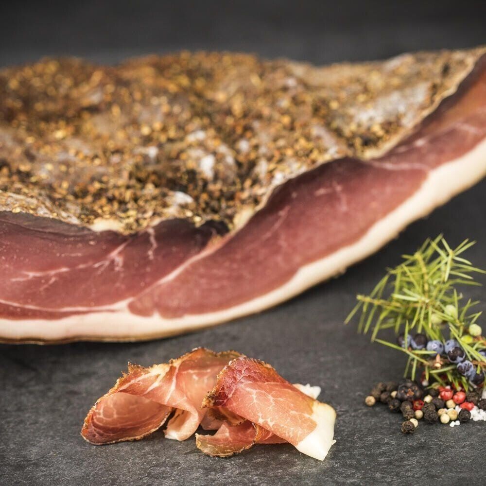 Der Bergschinken ist ein magerer und zugleich zarter Schinken, welcher am besten hauchdünn geschnitten zur Südtiroler Brotzeit gegessen wird.