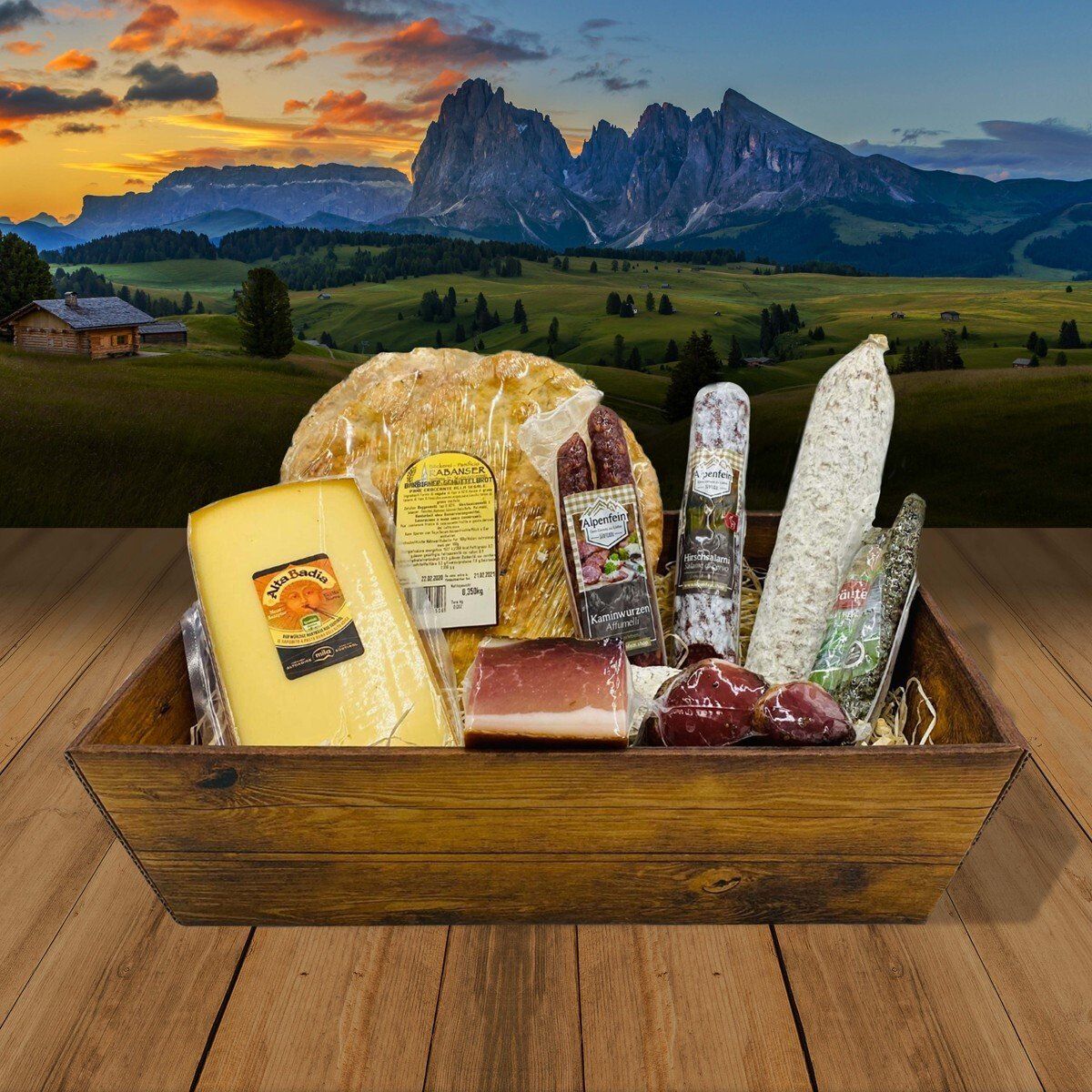 Erleben Sie ein wahres Genusserlebnis mit einer richtigen Südtiroler Marende von Alpenfein. Im Geschenkspaket "Großes Südtirol" finden Sie ein Stück Schinkenspeck, ein zartes Bergkräuterfilet, ein Stück Südtiroler Bergkäse, von Hand hergestelltes Schüttelbrot, rauchige Kaminwurzen, Kräuterkaminwurzen, eine Hirschsalami, sowie eine würzige Bergsalami und eine Jägersalami. Wir bringen ein echtes Stück Südtirol zu Ihnen nach Hause.