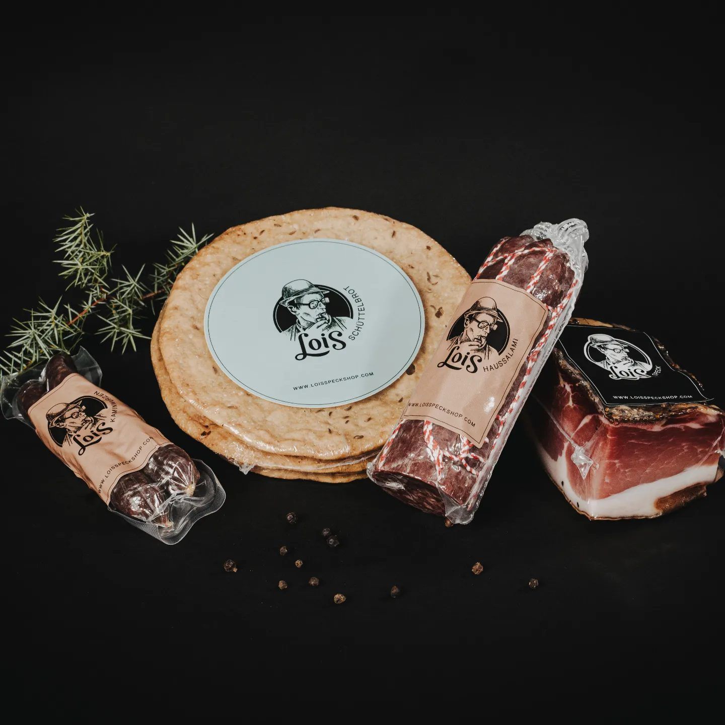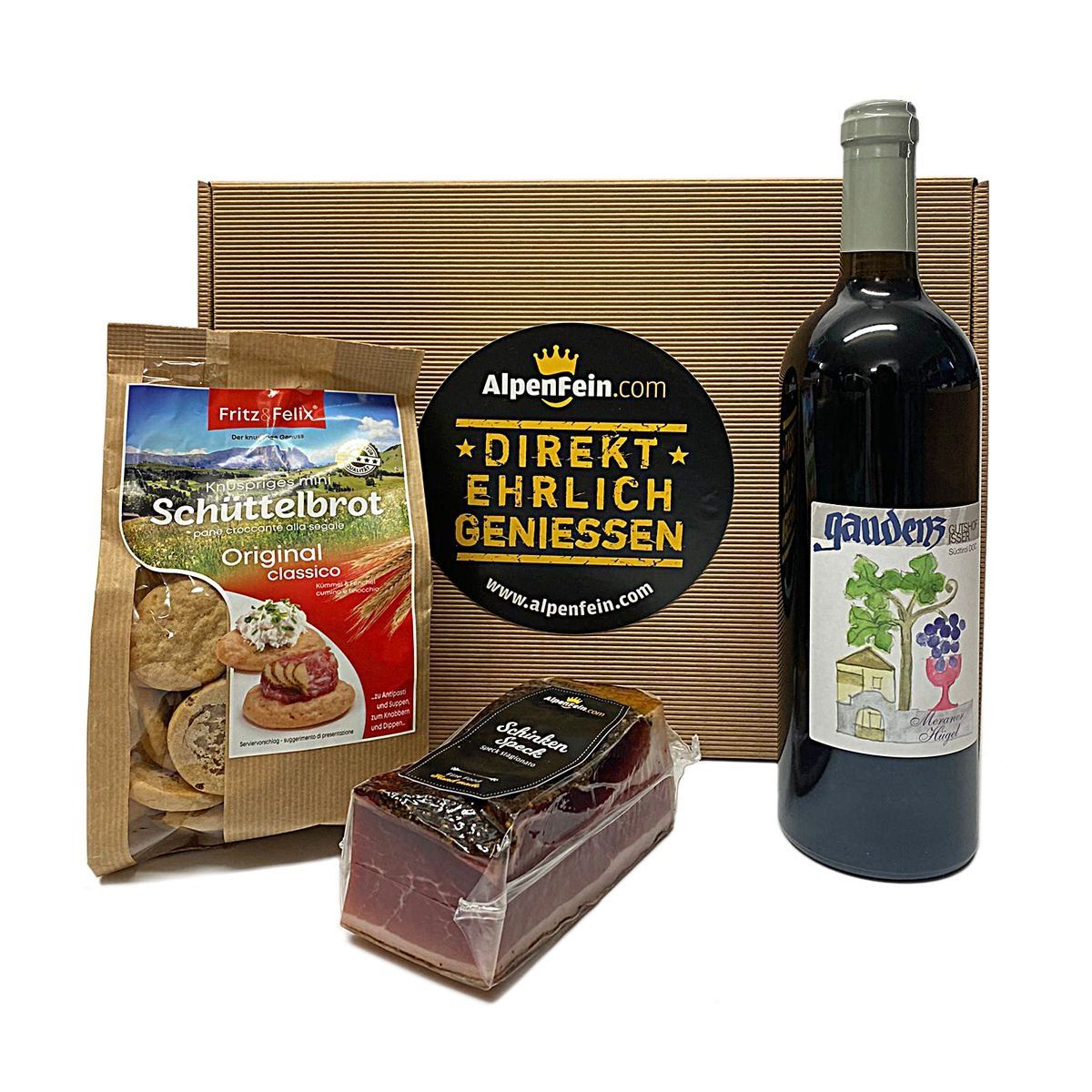 Erleben Sie ein wahres Genusserlebnis mit einer richtigen Südtiroler Marende von Alpenfein. Im Geschenkspaket "Kleines Südtirol" finden Sie ein Stück Schinkenspeck, einen würzigen Bergkäse, knuspriges Mini Schüttelbrot, rauchige Kaminwurzen mit Hirsch, sowie eine feine Bauernsalami. Wir bringen ein echtes Stück Südtirol zu Ihnen nach Hause.