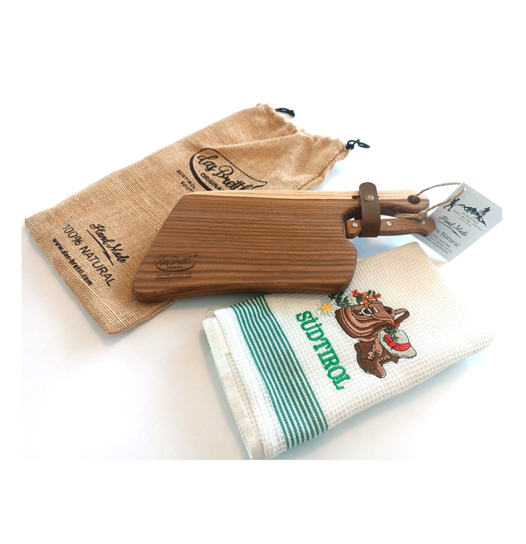 Im Geschenkspaket "A kluane Tasch voll Guats" finden Sie fein geschnittenen Schinkenspeck ,einen herzhaften Bergkäse, Vinschgauer Brot zum selbst aufbacken, richtigen Südtiroler Apfelsaft, sowie eine Salami mit Walnüssen. Wir bringen ein echtes Stück Südtirol zu Ihnen nach Hause.